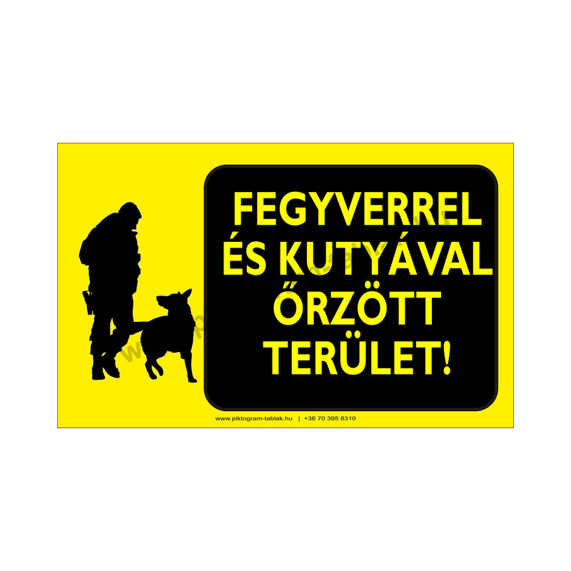 Ez a figyelmeztető jelzés egyértelműen mutatja, hogy az adott terület fegyverrel és kutyával őrzött. Használata ajánlott magánterületek, ipari létesítmények, raktárak, telephelyek és gazdasági udvarok védelmére