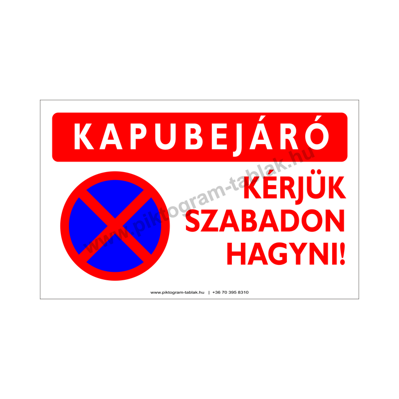 A „Kapubejáró! Kérem szabadon hagyni!” figyelmeztető piktogram tábla és matrica szabványos jelzés, amely előtt jelzi, hogy a bejárati területet tiltja eltorlaszolni vagy parkolásra. A piros-fehér jól látható, így mindenki számára egyértelmű feliratot közvetít. A kapubejáró tábla használata kifejezetten ajánlott társasházaknál, családi házaknál, üzleteknél, raktáraknál, ipari telephelyeken és minden olyan helyen, ahol fontos a szabad ki- és behajtás. A termék többféle méretben rendelhető, tartós hablemez táblaként és öntapadó matricaként is. Igény esetén a táblát kétoldali ragasztócsíkkal is szállítjuk, amely lehetővé teszi a gyors és egyszerű kihelyezést fúrás és csavarozás nélkül. Megbízható figyelmeztető jelzés közvetlenül a gyártótól, rövid szállítási határidővel.
