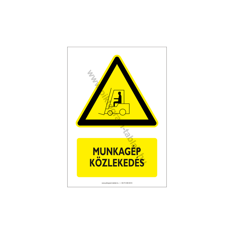 Ez a figyelmeztető jelzés a munkagépek mozgására hívja fel a figyelmet. Használata kötelező építkezéseken, ipari üzemekben, raktárakban és minden olyan területen, ahol targoncák, daruk vagy más munkagépek közlekednek.