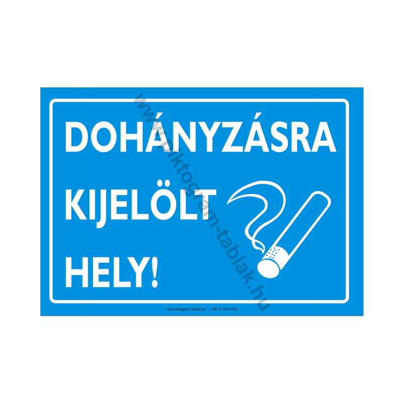 A „Dohányzásra kijelölt hely” munkavédelmi piktogram tábla és matrica világosan jelzi a dohányzásra engedélyezett területet. A szabványos kék-fehér jelzés mindenki számára könnyen felismerhető, így segít betartani a nemdohányzók védelmét szolgáló előírásokat és a munkavédelmi szabályokat. Használata kötelező üzemekben, irodaházakban, közintézményekben, szállodákban, éttermekben, kórházakban, bevásárlóközpontokban és minden olyan nyilvános helyen, ahol a dohányzás kizárólag kijelölt területen engedélyezett. A jelzés hozzájárul a rendezettséghez, a higiéniai normák betartásához és a biztonságos környezet kialakításához. Többféle méretben rendelhető, strapabíró hablemez táblaként és tartós öntapadó matricaként. Igény esetén kétoldali ragasztócsíkkal is szállítjuk, amely gyors és fúrás nélküli kihelyezést tesz lehetővé.