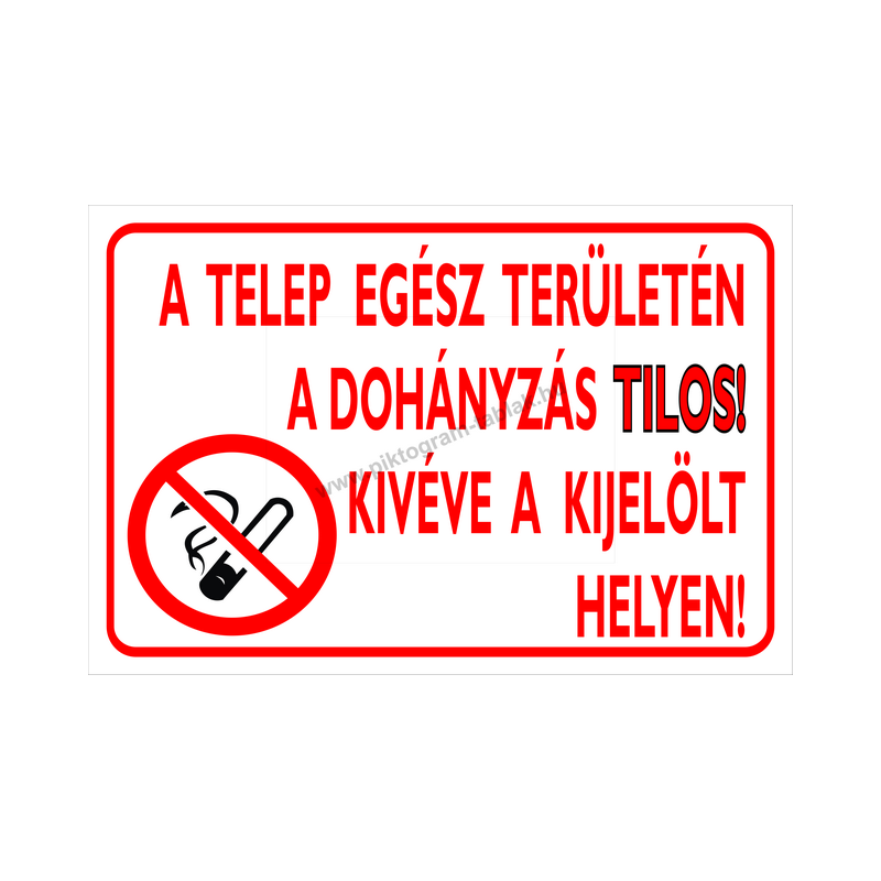 Az „A telep egész területén a dohányzás tilos! Kivéve a kijelölt helyen” tűzvédelmi piktogram tábla és matrica szabványos tiltó jelzés, amely világosan mutatja, hogy a dohányzás a teljes területen tilos, kivéve az erre kijelölt dohányzóhelyeken. A piros-fehér felirat mindenki számára jól látható és egyértelmű, így segíti a tűzvédelmi szabályok betartását és a balesetek megelőzését. A jelzés alkalmazása ajánlott ipari telephelyeken, raktárakban, üzemekben, irodaházaknál, szállodákban, parkolóházakban és közintézményekben. A termék többféle méretben rendelhető, tartós hablemez táblaként és öntapadó matricaként is. Igény esetén a táblát kétoldali ragasztócsíkkal szállítjuk, amely gyors és egyszerű kihelyezést biztosít fúrás nélkül.
