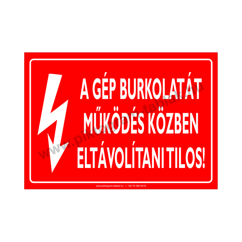 A „A gép burkolatát érintés közben eltávolítani tilos” villamossági piktogram tábla és matrica szabványos biztonsági jelzés, amely a balesetek és áramütések megelőzését szolgálja. A piros-fehér színvilágú, jól látható tiltó jelzés figyelmeztet arra, hogy a gép vagy elektromos berendezés burkolatát működés közben tilos eltávolítani, mert súlyos sérülést vagy életveszélyes áramütést okozhat. Használata kötelező ipari üzemekben, gyártósorokon, gépkarbantartási helyiségekben, villamos elosztók és kapcsolószekrények közelében. A tábla strapabíró hablemezből, a matrica pedig időjárás- és UV-álló öntapadó anyagból készül. Beltéri és kültéri használatra egyaránt alkalmas, több méretben elérhető. Igény esetén kétoldali ragasztóval is kérhető a gyors, fúrás nélküli kihelyezéshez.